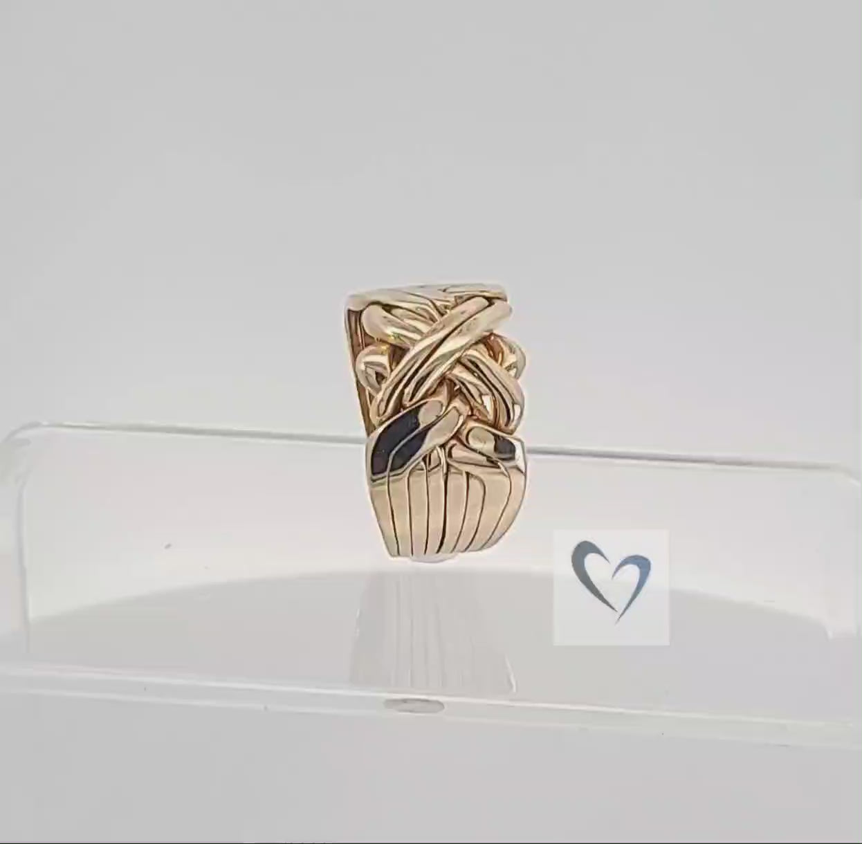 The 14K 8 Band Puzzle Ring (8B141) is one of our most classic and substantial designs, featuring eight interlocking bands crafted from solid 14K gold. This heavy, heirloom-quality ring averages 15 grams of gold, making it both durable and luxurious.