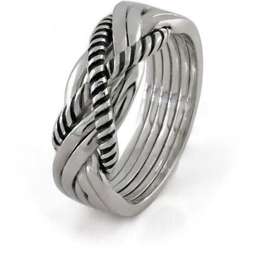 A stunning and timeless sterling silver puzzle ring, admired for its elegant complexity, craftsmanship, and brilliant shine.